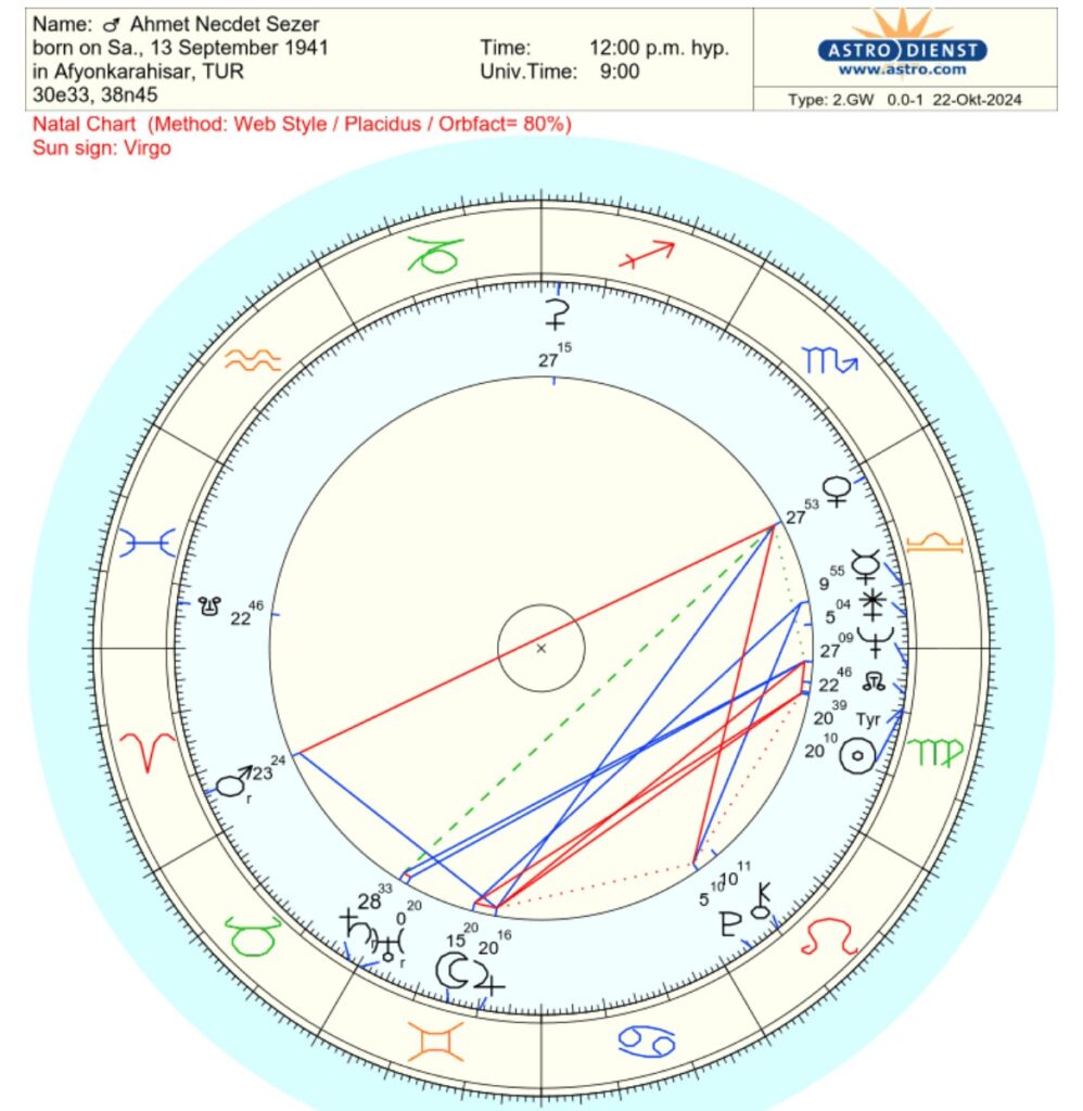 Türk hukukçu Ahmet Necdet Sezer, doğum haritasına baktığımızda, Güneş-Jüpiter, Venüs- Jüpiter, Mars- Jüpiter bağlantılarını ve Tyr asteroidinin ise Güneş ile kavuşumda olduğunu görüyoruz.