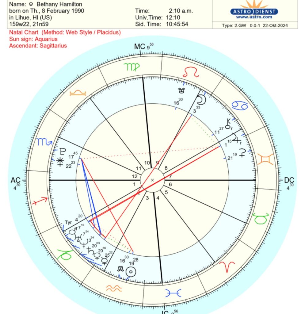 Amerikalı sörfçü Bethany Hamilton, sörf yaparken köpek balığının saldırısına uğruyor ve sol kolunu kaybediyor. Ancak korkunç kaza onu sörf yapmaktan alıkoyamadı, 6 aylık tedavinin ardından yeniden yarışmalara katıldı. 2004 yılında ESPY ödüllerinde “Geri dönüş yapan en iyi atlet” ödülünü kazandı. Bethany Hamilton’un haritasına baktığımızda, Tyr asteroidinin Mars, Uranüs, Neptün, Satürn kümeleşmesine eşlik ettiğini görüyoruz.