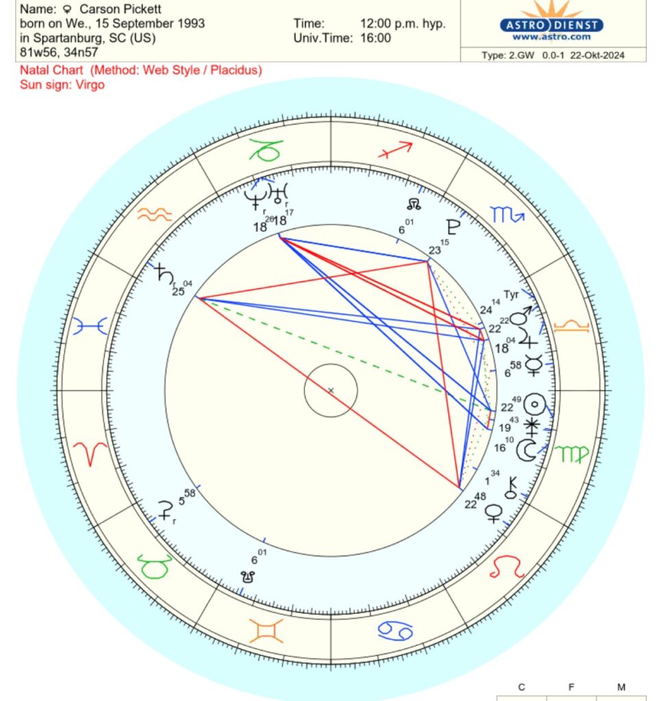 Amerikalı profesyonel futbolcu Carson Pickett, ABD Kadın Millî Futbol Takımında oynayan fiziksel engelli sol bek oyuncudur. Carson Pickett sol kolu ve eli olmadan doğdu. Ancak engelli doğması ona hiçbir zaman yıldırmadı, azimle çalıştı birçok kişiye ilham kaynağı oldu. Carson Pickett’in haritasına baktığımızda, Tyr asteroidini Mars, Jüpiter ile kavuşumda görüyoruz.